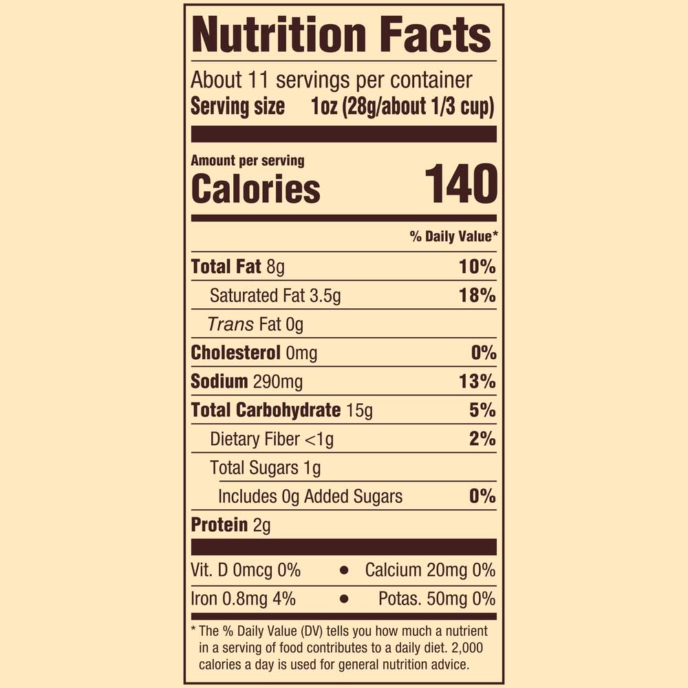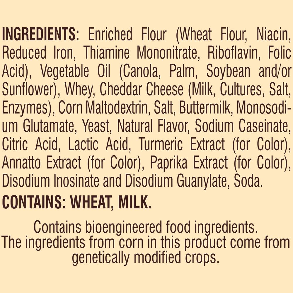 Ingredients: INGREDIENTS: ENRICHED FLOUR (WHEAT FLOUR, NIACIN, REDUCED IRON, THIAMINE MONONITRATE, RIBOFLAVIN, FOLIC ACID), VEGETABLE OIL (CANOLA, PALM, SOYBEAN AND/OR SUNFLOWER), WHEY, CHEDDAR CHEESE (MILK, CULTURES, SALT, ENZYMES), CORN MALTODEXTRIN, SALT, BUTTERMILK, MONOSODIUM GLUTAMATE, YEAST, NATURAL FLAVOR, SODIUM CASEINATE, CITRIC ACID, LACTIC ACID, TURMERIC EXTRACT (FOR COLOR), ANNATTO EXTRACT (FOR COLOR), PAPRIKA EXTRACT (FOR COLOR), DISODIUM INOSINATE AND DISODIUM GUANYLATE, SODA. CONTAINS: WHEAT, MILK Contains: CONTAINS: Gluten, Milk/Dairy, Wheat