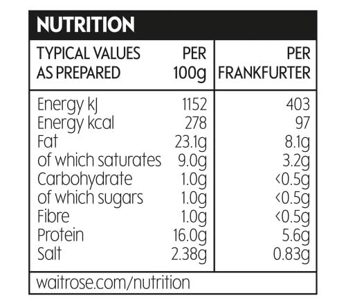 10 Cooked and beechwood smoked frankfurter pork sausages. Beechwood smoked for that classic hot dog taste. Just heat and serve in buns with onions, mustard and ketchup for the full experience or try chopped in pasta sauces and one pots for added flavour. All our continental meats come from carefully selected farms we know and trust. Theyre run by dedicated farmers who meet leading European welfare standards. Whether its salami or chorizo, pizza toppings or tapas platters, our providers give their pigs more space and better living conditions.