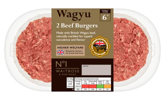 2 British Wagyu beef burgers with seasoning. Marble Score 6+, Made with British Wagyu beef, naturally marbled for superb succulence and flavor, Higher Welfare, Raised by farmers we know and trust, Wagyu Breeders Association Approved Fully WBA Azured • Waitrose Limited, Bracknell, Berkshire, RG12 8YA • Packaging: Reusable
