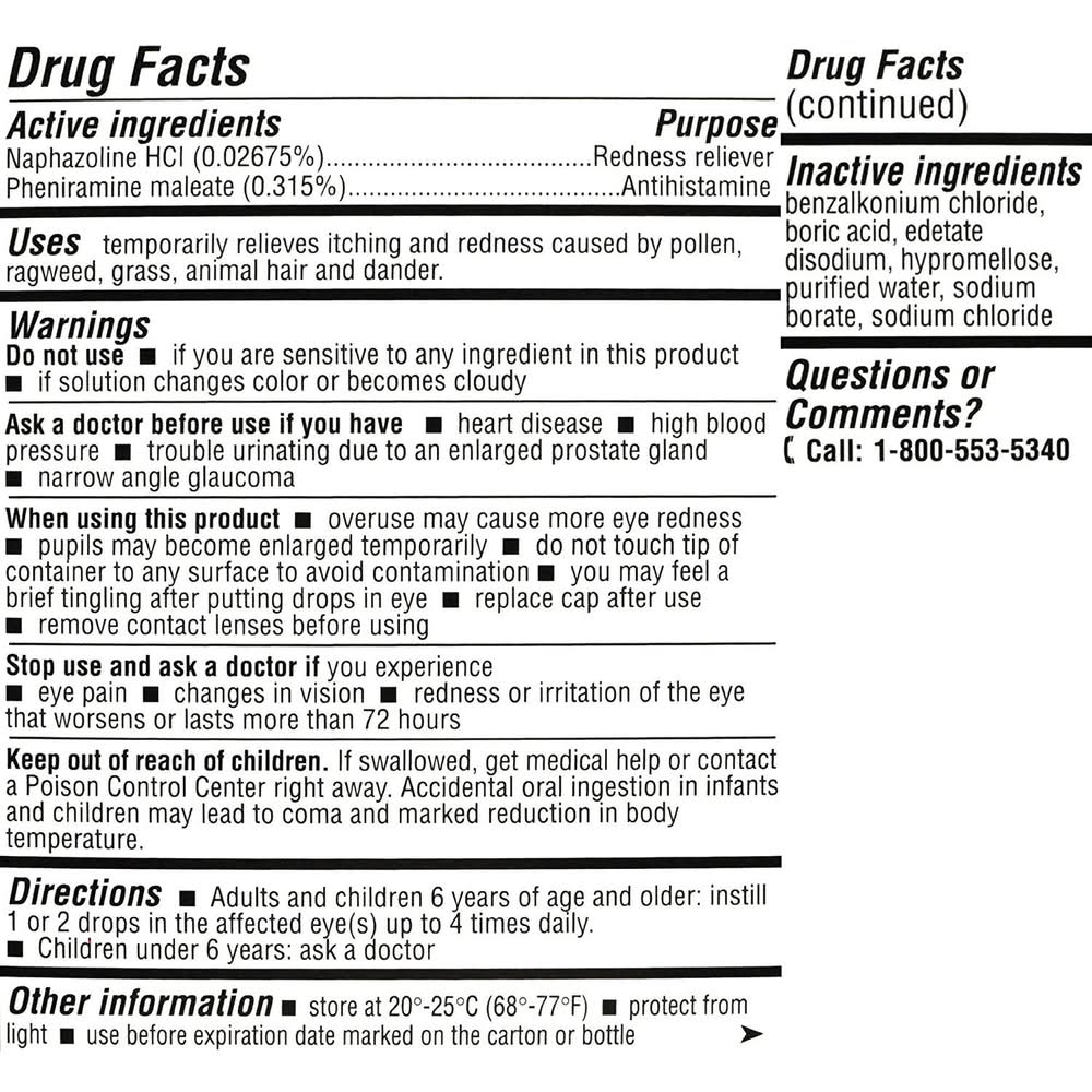 Ingredients: Naphazoline HCl 0.02675 %, Redness Reliever; Pheniramine Maleate 0.315 %, Antihistamine Additives: Benzalkonium Chloride, Boric Acid, Edetate Disodium, Hypromellose, Purified Water, Sodium Borate, Sodium Chloride., Hydrochloric Acid May be used to Adjust pH.