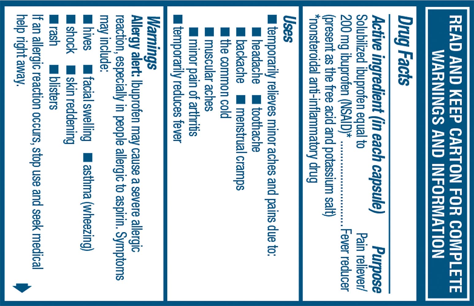 Ingredients: In Each Capsule: Active Ingredients: Solubilized Ibuprofen Equal to Ibuprofen (NSAID) (Present as the Free Acid and Potassium Salt) (200 mg), Pain Reliever/Fever Reducer. Additives: Inactive Ingredients: FD&C Green 3, Gelatin, Lecithin (Soybean), Medium Chain Triglycerides, Pharmaceutical Ink,, Polyethylene Glycol, Potassium Hydroxide, Purified Water, Sorbitol Sorbitan Solution. *Nonsteroidal Anti-Inflammatory Drug.