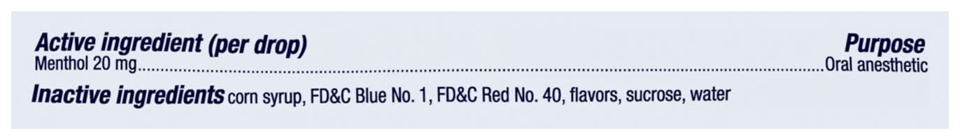 Ingredients: Per Drop: Active Ingredients: Menthol (20 mg), Oral Anesthetic. Inactive Ingredients: Corn Syrup, FD&C Blue 1, FD&C Red 40, Flavors, Sucrose, Water Contains: Soybeans