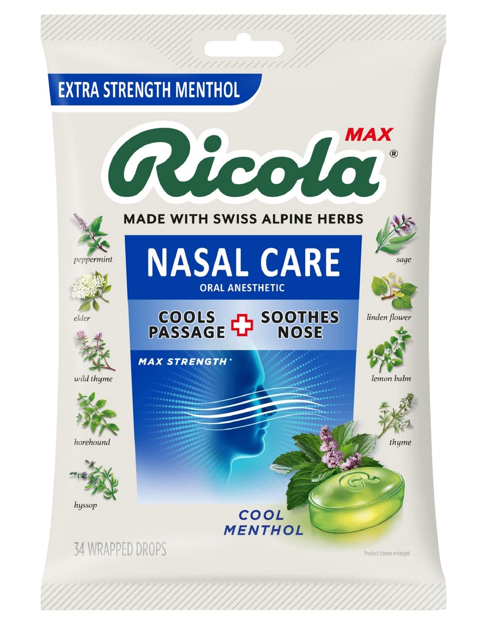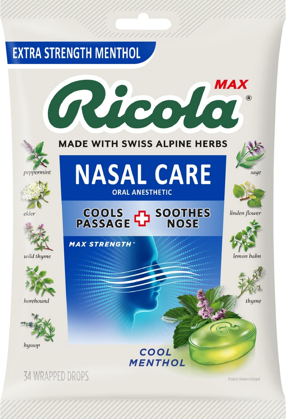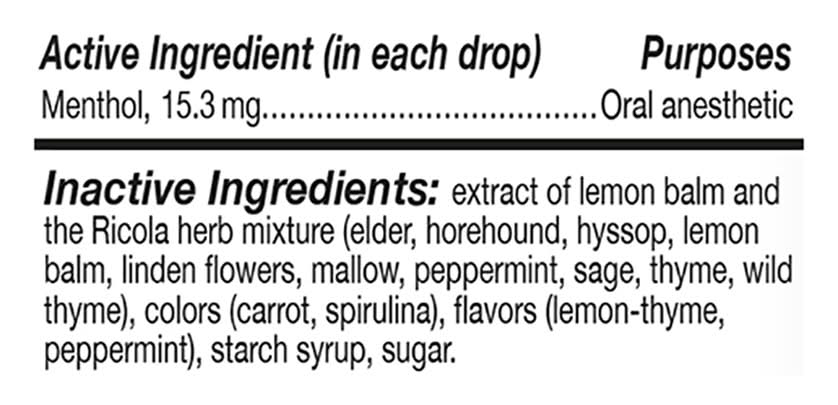 Ingredients: In Each Drop Active Ingredients: Menthol (15.3 mg), Oral Anesthetic. Inactive Ingredients: Extract of Lemon Balm and the Ricola Herb Mixture (Elder, Horehound, Hyssop, Lemon Balm, Linden Flowers, Mallow, Peppermint, Sage, Thyme, Wild Thyme), Colors (Carrot, Spirulina), Flavors (Lemon-Thyme, Peppermint), Starch Syrup, Sugar Additives: Inactive Ingredients: Extract of lemon balm and the Ricola herb mixture, colors, flavors, starch syrup, sugar