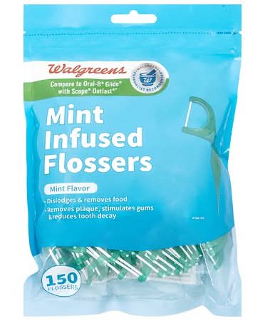 Walgreens Infused Flossers Mint are designed to remove food particles, eliminate plaque, stimulate gums, and aid in reducing tooth decay. These flossers are manufactured in China and offer a refreshing mint flavor.