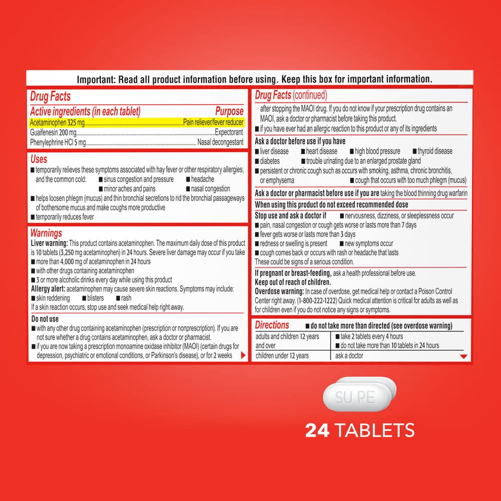 Ingredients: Active Ingredients (in each caplet): Acetaminophen 325 mg (Pain reliever/fever reducer) Guaifenesin 200 mg (Expectorant) Phenylephrine HCl 5 mg (Nasal decongestant) Inactive Ingredients: Carnauba wax, croscarmellose sodium, hydroxypropyl cellulose, hypromellose, magnesium stearate, microcrystalline cellulose, pregelatinized starch, titanium dioxide, triacetin