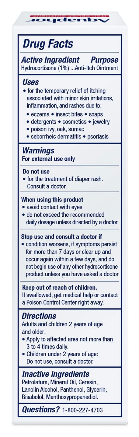 Ingredients: Active ingredients: Hydrocortisone 1% (Purpose: Anti-Itch Ointment)... Inactive ingredients: Petrolatum, Mineral Oil, Ceresin, Lanolin Alcohol, Panthenol, Glycerin, Bisabolol, Menthoxypropanediol.