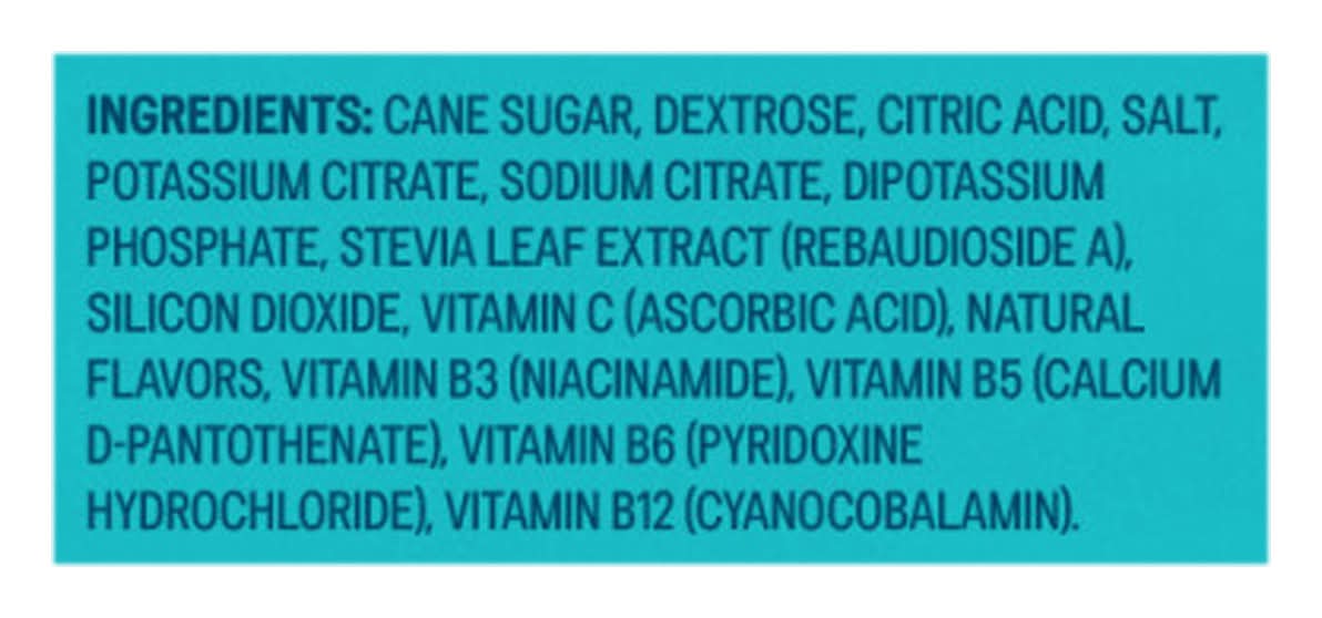 Ingredients: Cane Sugar, Dextrose, Citric Acid, Salt, Potassium Citrate, Sodium Citrate, Dipotassium Phosphate, Stevia Leaf Extract (Rebaudioside A), Silicon Dioxide, Vitamin C (Ascorbic Acid), Natural Flavors, Vitamin B3 (Niacinamide), Vitamin B5 (Calcium D-Pantothenate), Vitamin B6 (Pyridoxine Hydrochloride), Vitamin B12 (Cyanocobalamin)