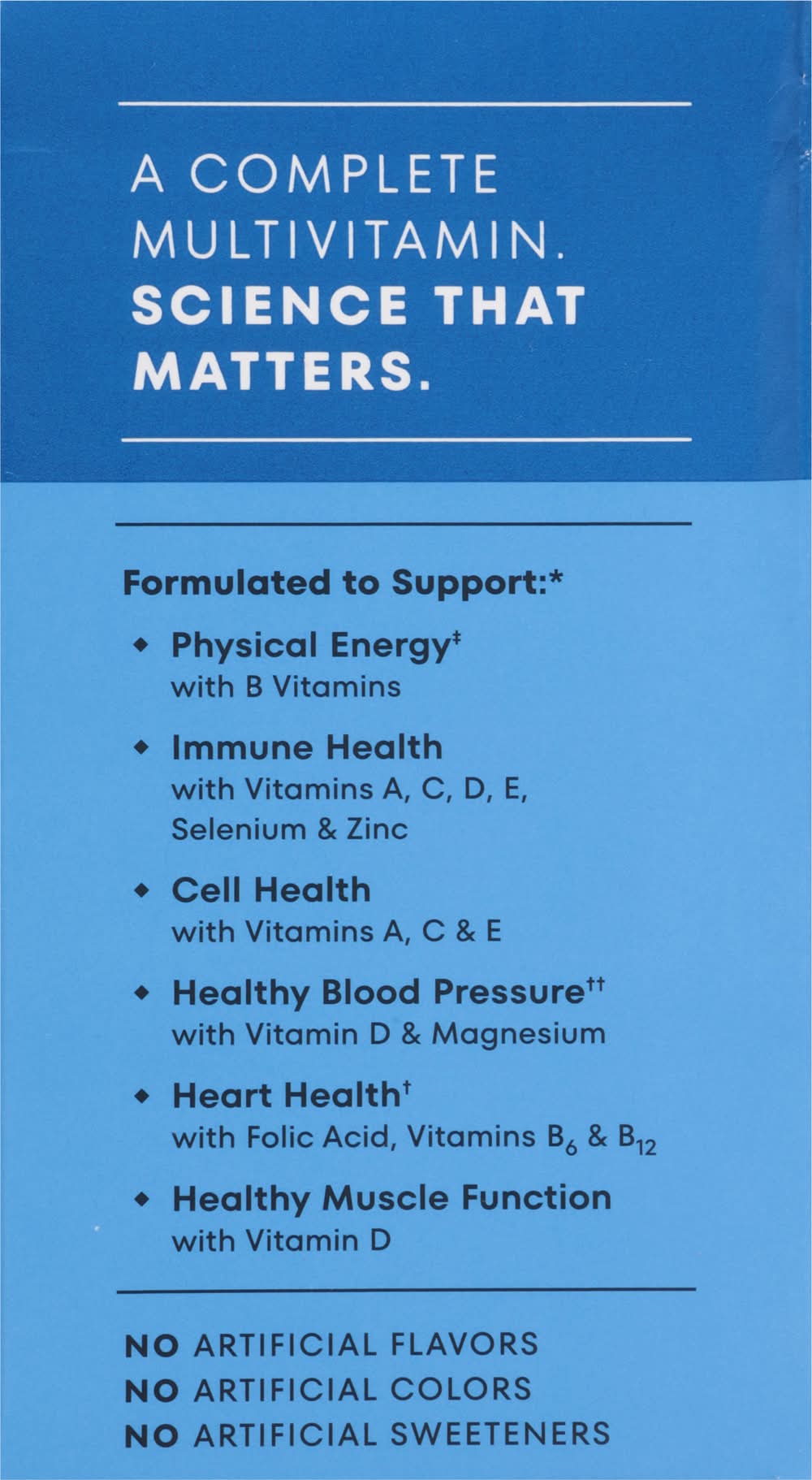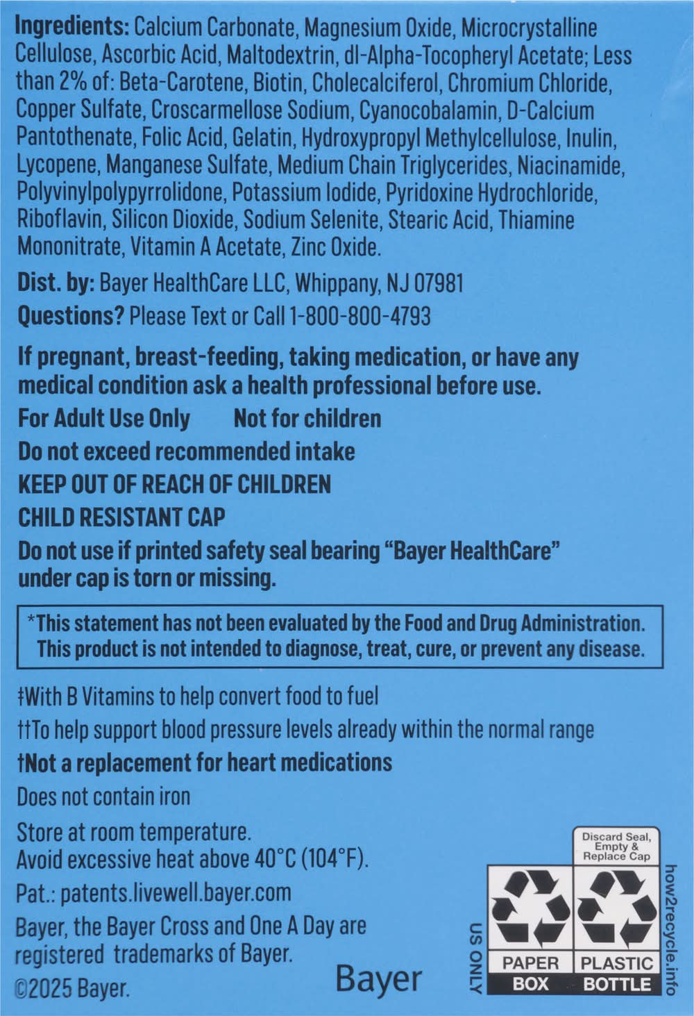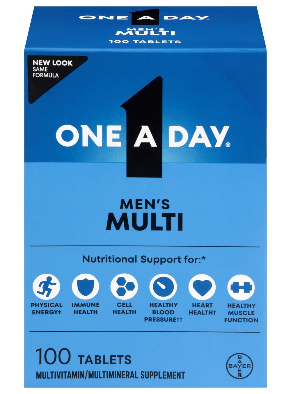 Support your active lifestyle with One A Day men's multivitamin. These men's vitamins are specially designed with key nutrients to support 6 key vital functions:* physical energy with B Vitamins (1), immune health with Vitamins A, C, D, E, Selenium and Zinc, healthy muscle function with Vitamin D and Magnesium, heart health (2) with Folic Acid and Vitamins B6 & B12, healthy blood pressure (3) with Vitamin D and Magnesium, and cell health with Vitamins A, C, E, and Zinc. Rich in 19 key nutrients, • male • Bayer Healthcare LLC, Whippany,NJ,07981 • Packaging: Reusable