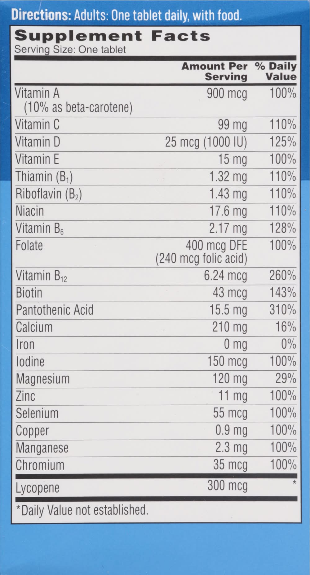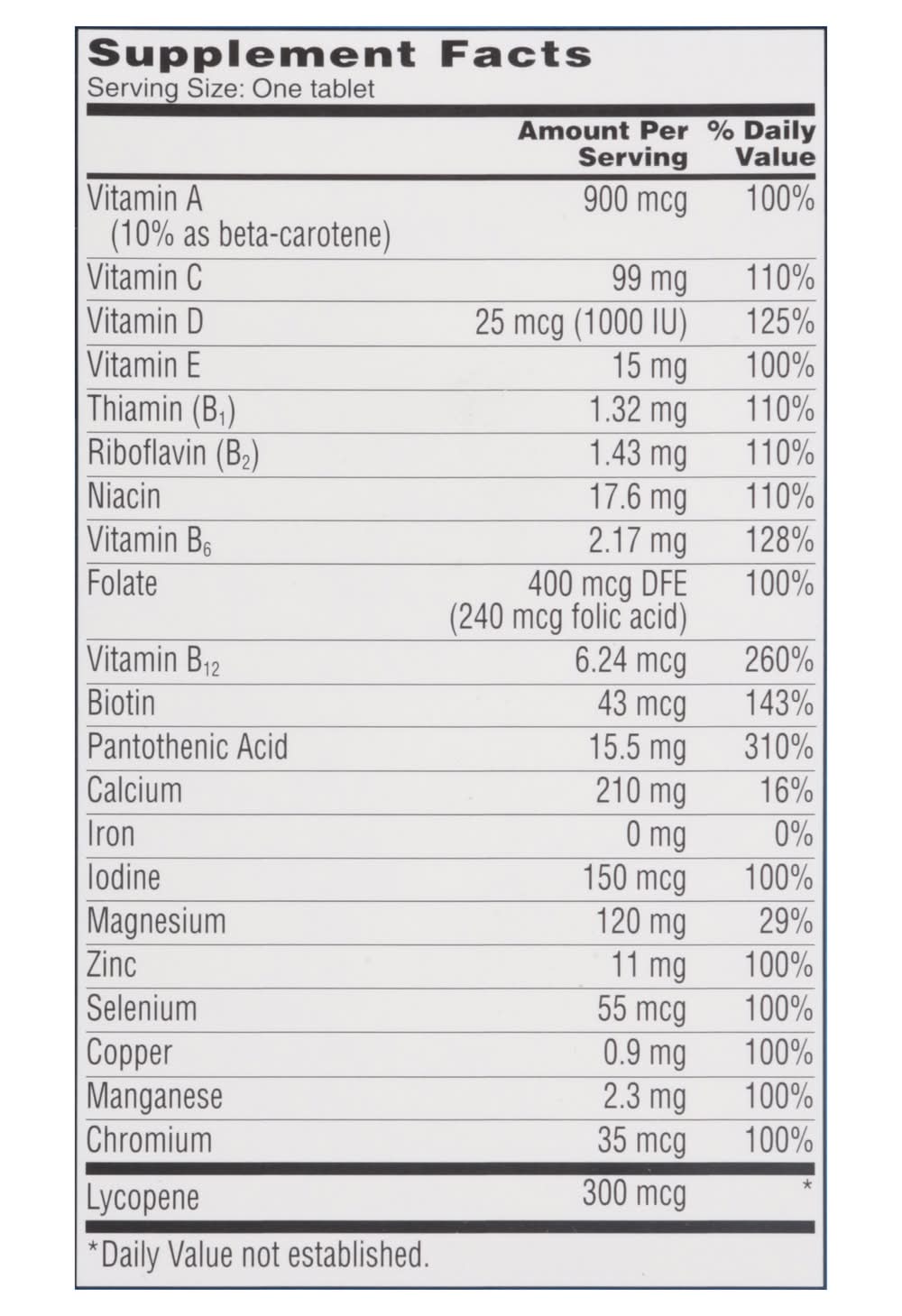 Ingredients: Calcium Carbonate, Magnesium Oxide, Microcrystalline Cellulose, Ascorbic Acid, Maltodextrin, DL-Alpha-Tocopheryl Acetate; Less than 2% of: Beta-Carotene, Biotin, Cholecalciferol, Chromium Chloride, Copper Sulfate, Croscarmellose Sodium, Cyanocobalamin, D-Calcium Pantothenate, Folic Acid, Gelatin, Hydroxypropyl Methylcellulose, Inulin, Lycopene, Manganese Sulfate, Medium Chain Triglycerides, Niacinamide, Polyvinylpolypyrrolidone, Potassium Iodide, Pyridoxine Hydrochloride, Riboflavin, Silicon Dioxide, Sodium Selenite, Stearic Acid, Thiamine Mononitrate, Vitamin A Acetate, Zinc Oxide