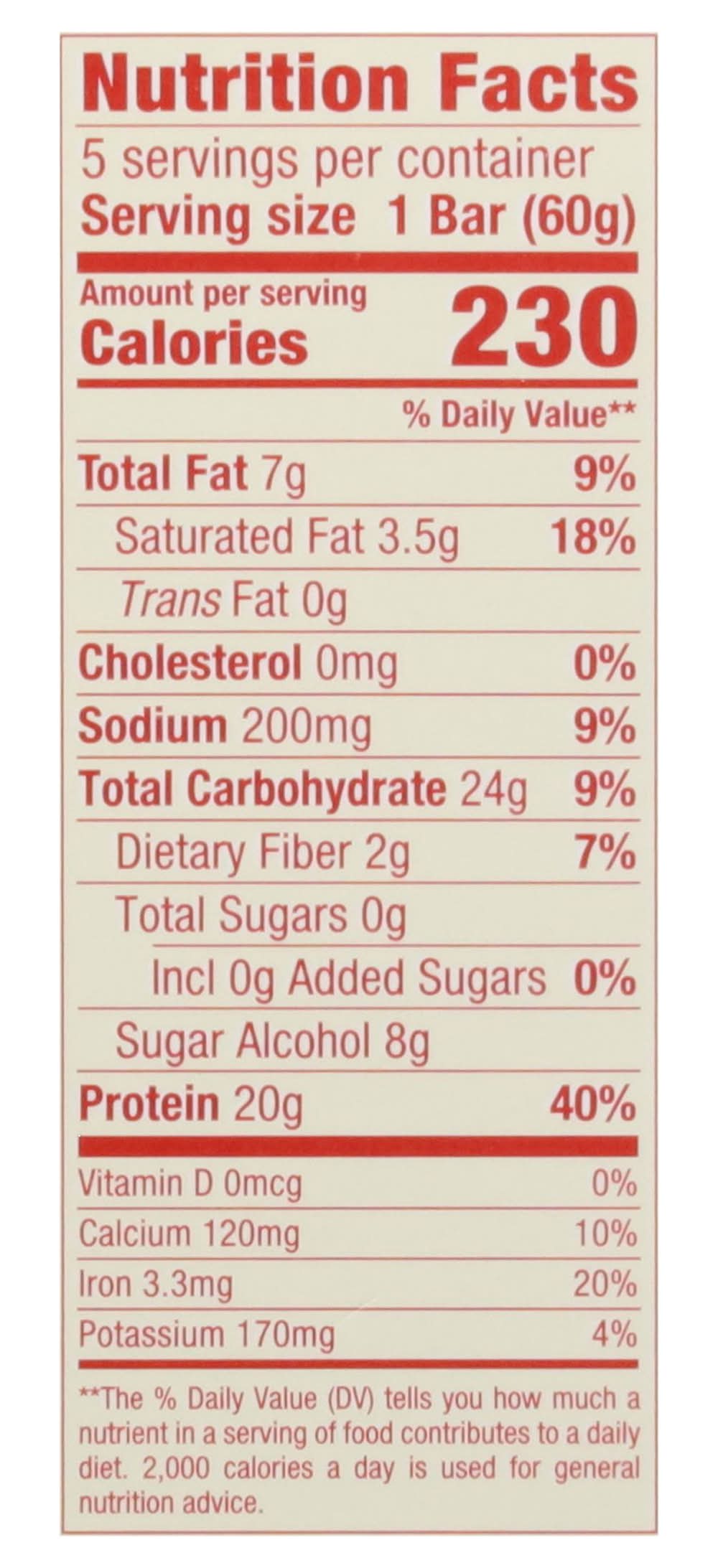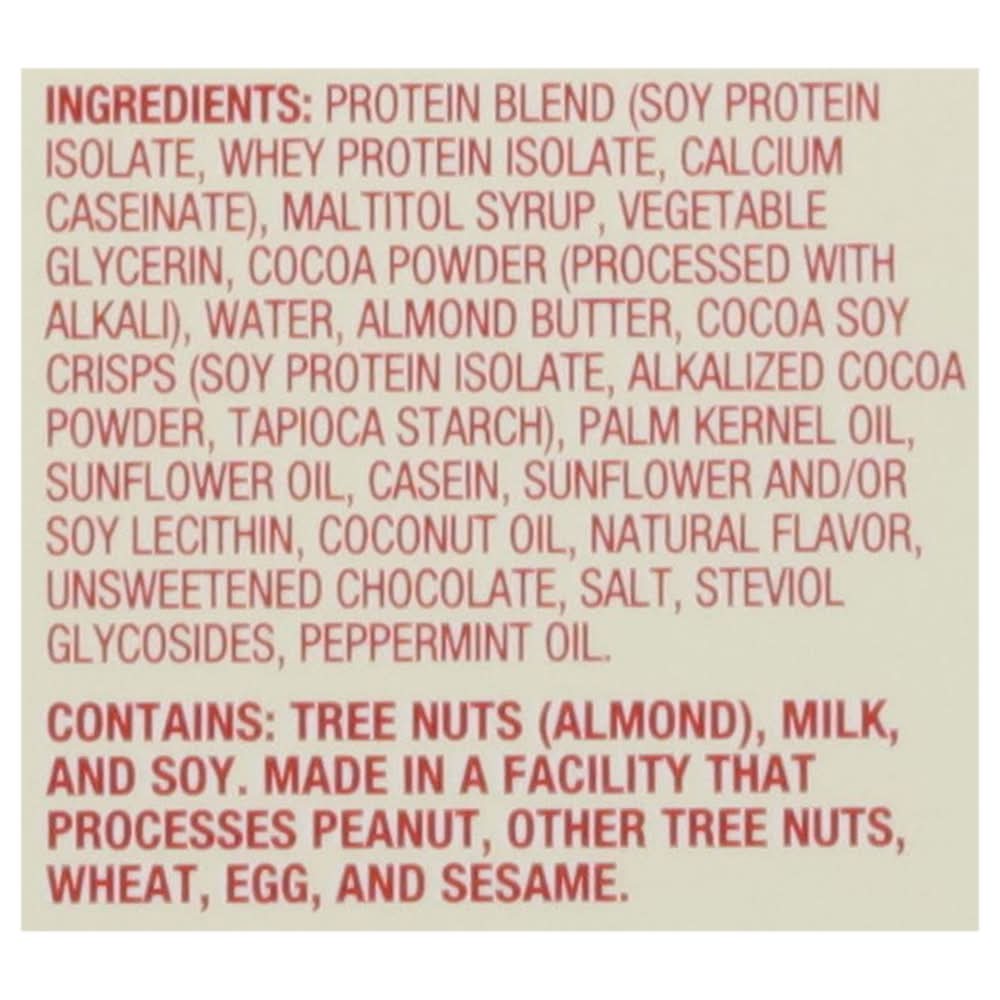 Ingredients: Protein Blend (Soy Protein Isolate, Whey Protein Isolate, Calcium Caseinate), Maltitol Syrup, Vegetable Glycerin, Cocoa Powder (Processed with Alkali), Water, Almond Butter, Cocoa Soy Crisps (Soy Protein Isolate, Alkalized Cocoa Powder, Tapioca Starch), Palm Kernel Oil, Sunflower Oil, Casein, Sunflower and/or Soy Lecithin, Coconut Oil, Natural Flavor, Unsweetened Chocolate, Salt, Steviol Glycosides, Peppermint Oil Contains: Tree Nuts, Tree Nuts, Almonds, Milk, Soybeans, Peanuts, Tree Nuts, Wheat, Eggs, Sesame