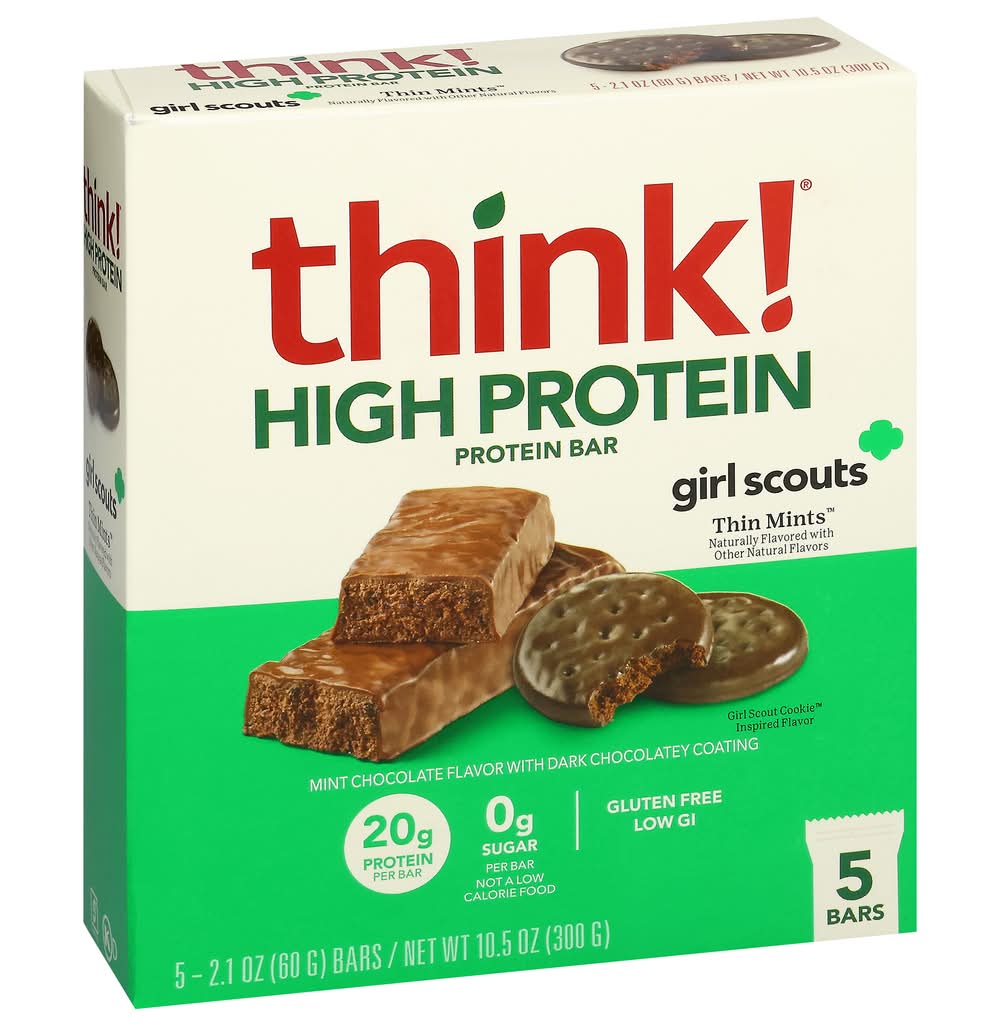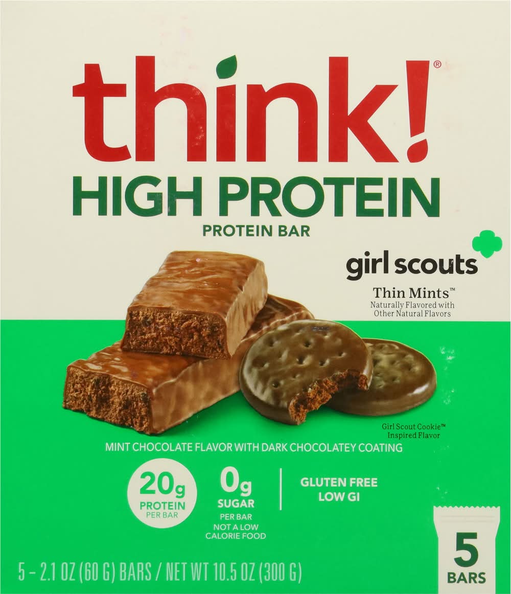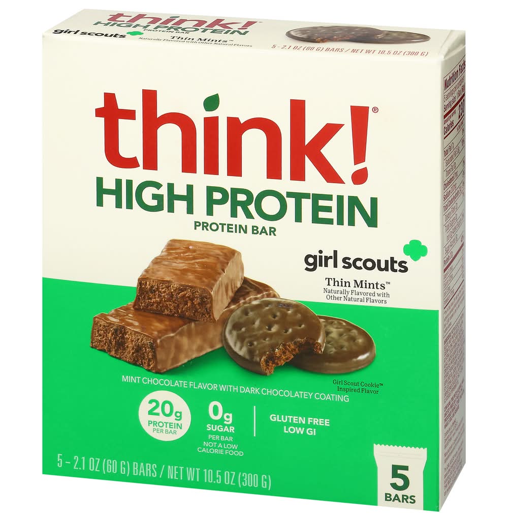 20g Protein, 0g Sugar, Gluten-Free, Low-GI, Each think! bar blends delicious flavors with the satisfying protein punch you need to support your goals. Every bite of this Girl Scout Thin Mints inspired protein bar blends mint chocolate flavor with dark chocolatey coating. So, whether you are on the go, need a snack halfway up the trail, or crave a quick bite before your workout, grab a think! bar. • Flavor: Mint chocolate • Pack size: 5 • Packaging: Reusable