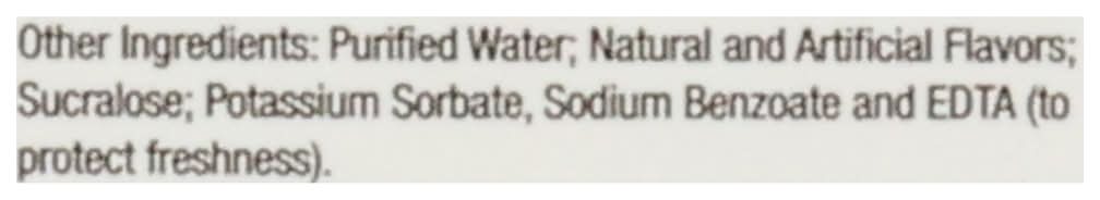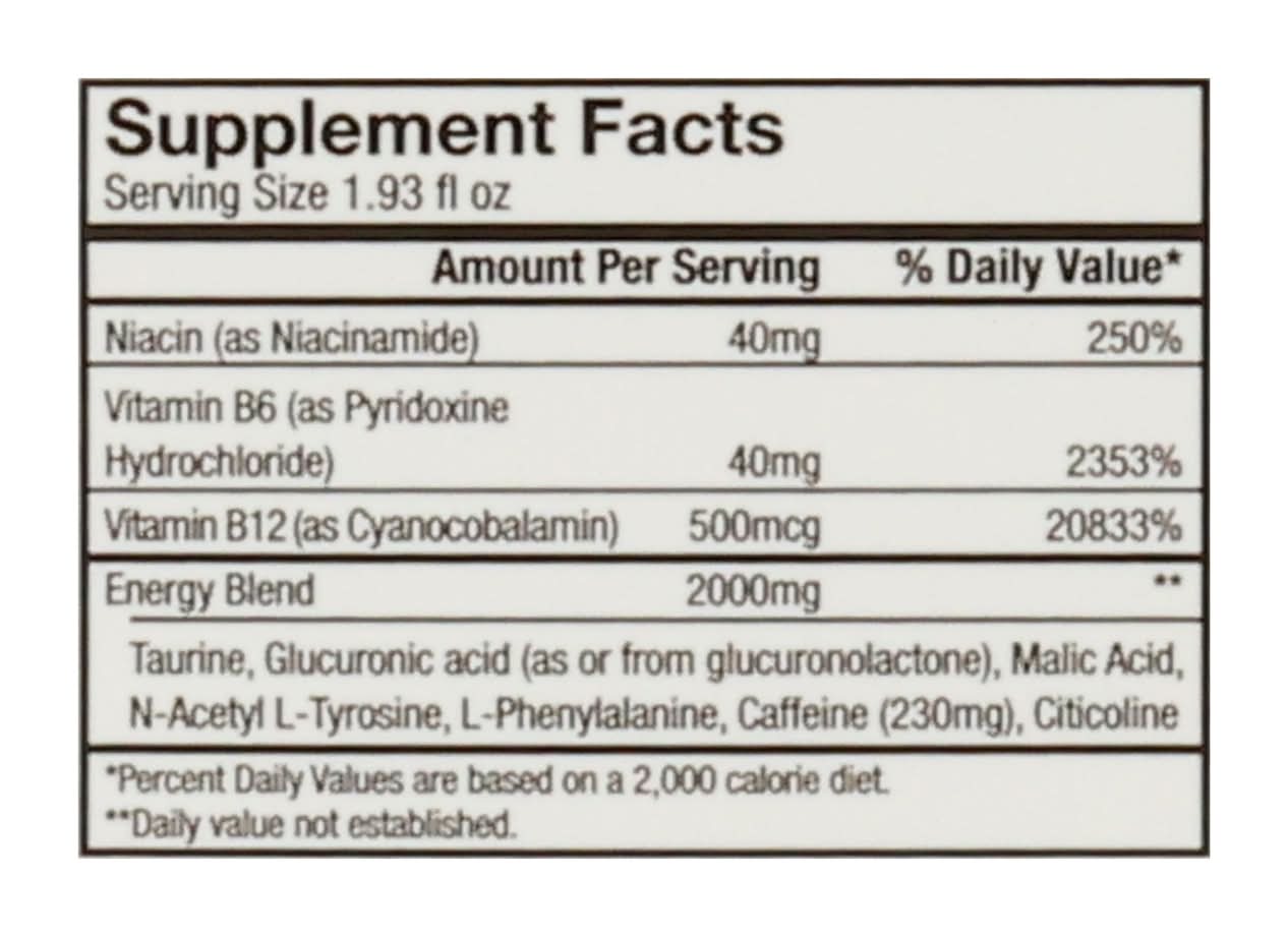 Ingredients: Energy Blend: Taurine, Glucuronic Acid (as or from Glucuronolactone), Malic Acid, N-Acetyl L-Tyrosine, L-Phenylalanine, Caffeine (230 mg), Citicoline. Other Ingredients: Purified Water; Natural and Artificial Flavors; Sucralose; Potassium Sorbate, Sodium Benzoate and EDTA (to Protect Freshness)