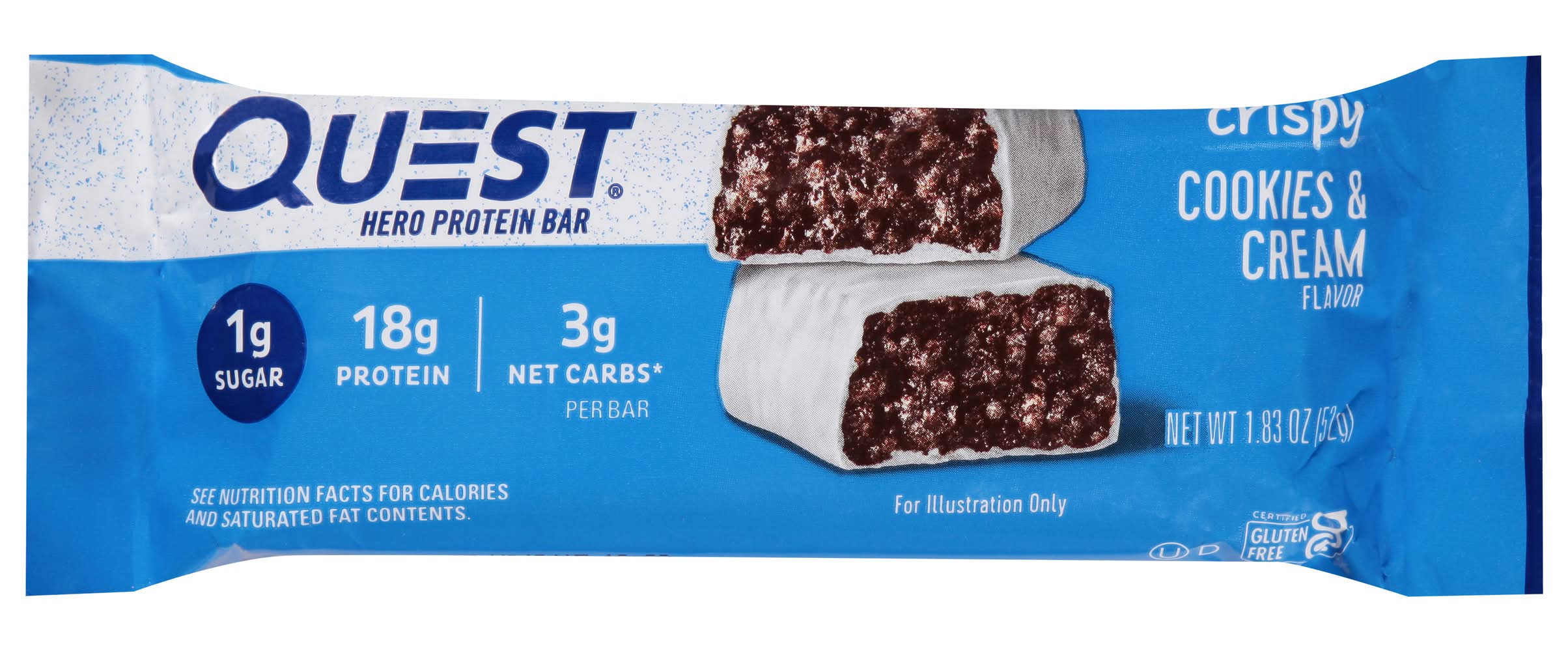 YOU DESERVE A SWEET TREAT: The Quest Cookies & Cream Hero Protein Bar tastes like an indulgent candy bar. Only our version has 17g protein, 3g net carbs and 1g of sugar. UNWRAP COMPLETE PROTEINS: The Quest Cookies & Cream Hero Protein Bars are made with complete, dairy-based proteins to provide your body with 9 essential amino acids. FIBER IS YOUR FRIEND: The Quest Cookies & Cream Hero Protein Bars have 6g of fiber to provide your body with a more complete macro profile. SWEET WITHOUT ALL THE Flavor: Cookies & cream