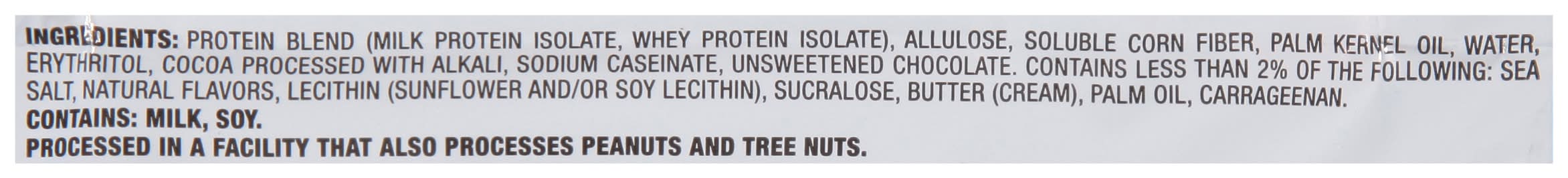 Ingredients: Protein Blend (Milk Protein Isolate, Whey Protein Isolate), Allulose, Soluble Corn Fiber, Palm Kernel Oil, Water, Erythritol, Cocoa Processed with Alkali, Sodium Caseinate, Unsweetened Chocolate. Contains Less than 2% of the Following: Sea Salt, Natural Flavors, Lecithin (Sunflower and/or Soy Lecithin), Sucralose, Butter (Cream), Palm Oil, Carrageenan Contains: Milk, Soybeans, Peanuts, Tree Nuts