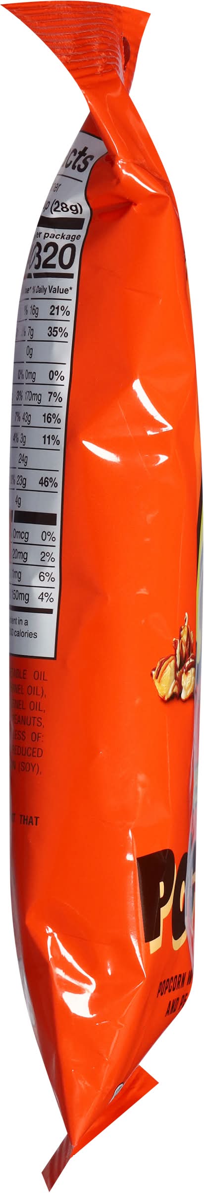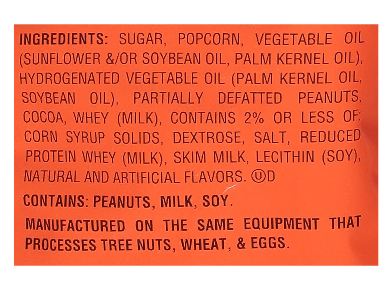 Ingredients: Sugar, Popcorn, Vegetable Oil (Sunflower &/or Soybean Oil, Palm Kernel Oil), Hydrogenated Vegetable Oil (Palm Kernel Oil, Soybean Oil), Partially Defatted Peanuts, Cocoa, Whey (Milk), Contains 2% or Less of: Corn Syrup Solids, Dextrose, Salt, Reduced Protein Whey (Milk), Skim Milk, Lecithin (Soy), Natural and Artificial Flavors Contains: Peanuts, Milk, Soybeans, Corn, Tree Nuts, Wheat, Eggs