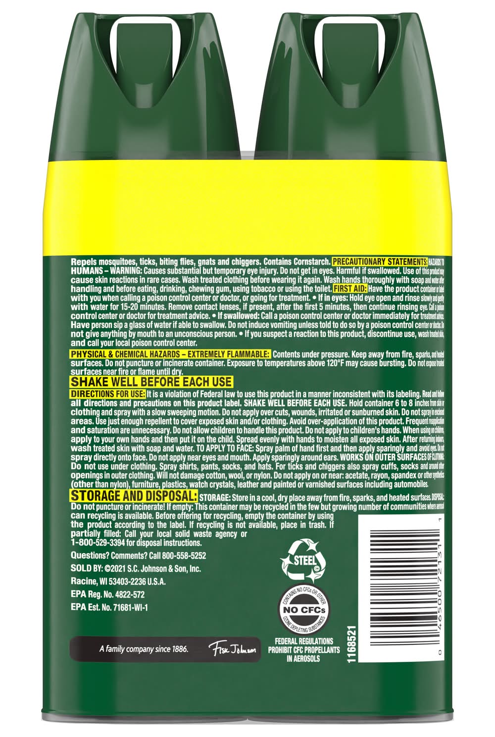 Off! Deep Woods Dry Insect Repellent VIII provides long-lasting protection against mosquitoes, ticks, biting flies, gnats, and chiggers. It is effective in repelling mosquitoes that may be carriers of various viruses. The formulation includes cornstarch and is free from CFCs or other ozone-depleting substances, in compliance with federal regulations that prohibit such propellants in aerosols. The product is packaged in a steel container. Packaging: Reusable