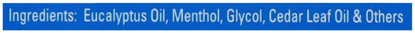 Ingredients: Eucalyptus Oil, Menthol, Glycol, Cedar Leaf Oil & Others