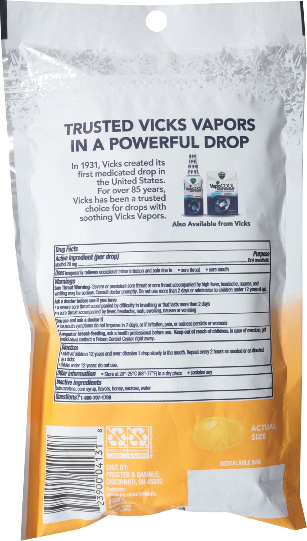 Ingredients: Per Drop: Active Ingredients: Menthol (20 mg), Oral Anesthetic. Inactive Ingredients: Beta-Carotene, Corn Syrup, Flavors, Honey, Sucrose, Water Additives: Beta-Carotene, Corn Syrup, Flavors, Honey, Sucrose, Water