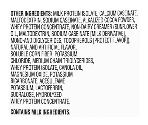 Ingredients: Other Ingredients: Milk Protein Isolate, Calcium Caseinate, Maltodextrin, Sodium Caseinate, Alkalized Cocoa Powder, Whey Protein Concentrate, Non-Dairy Creamer (Sunflower Oil, Maltodextrin, Sodium Caseinate [Milk Derivative], Mono-and Diglycerides, Tocopherols [Protect Flavor]), Natural and Artificial Flavor, Soluble Corn Fiber, Potassium Chloride, Medium Chain Triglycerides, Whey Protein Isolate, Canola Oil, Magnesium Oxide, Potassium Bicarbonate, Acesulfame Potassium, Lactoferrin, Sucralose, Hydrolyzed Whey Protein Concentrate Contains: Milk