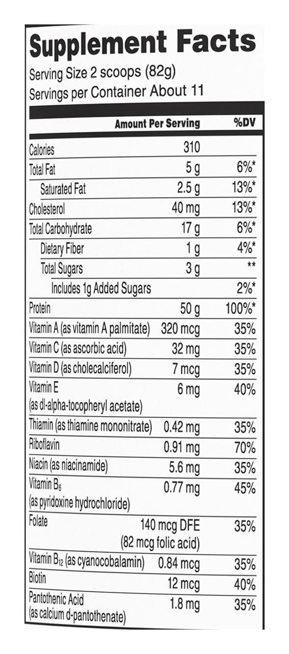 Naturally & artificially flavored. 50 g protein per serving. 3 g total sugars per serving. Soy & gluten free. Excellent source of 20 vitamins & minerals per serving. Excellent Source: Antioxidant vitamins C & E. Vitamin D, calcium, magnesium and phosphorus for strong bones. Protein Comparisons (Protein data from USDA Nutrient Database (ndb.nal.usda.gov) One serving Muscle Milk Pro Series Protein Powder (50 g protein). 6 jumbo eggs (48 g protein). 6 - 8 oz glasses skim milk (50 g protein). 5.6 • Cytosport, inc., Chicago,IL,60604 • Packaging: Reusable