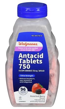 Walgreens Extra Strength Antacid Tablets provide relief from heartburn, sour stomach, and acid indigestion. Each bottle contains 96 chewable tablets that are both gluten-free and Kosher Pareve. These antacid tablets contain an active ingredient used for effective relief of acid discomfort.