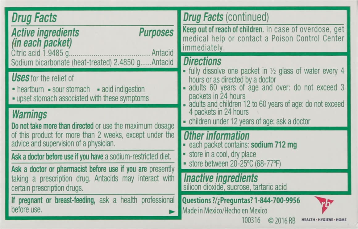 Ingredients: In Each Packet Active Ingredients: Citric Acid (1.9485 g), Antacid; Sodium Bicarbonate (Heat-Treated) (2.4850 g), Antacid. Inactive Ingredients: Silicon Dioxide, Sucrose, Tartaric Acid Additives: Silicon Dioxide, Sucrose, Tartaric Acid