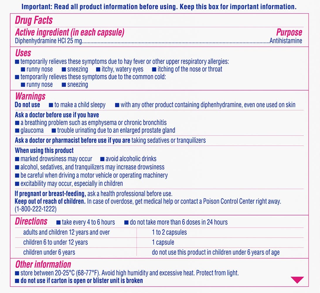 Ingredients: In Each Capsule: Active Ingredients: Diphenhydramine HCI (25 mg), Antihistamine. Inactive Ingredients: Gelatin, Glycerin, Polyethylene Glycol, Purified Water, Sorbitol. Capsules are imprinted with edible dye-free ink, Sorbitol. Capsules Are Imprinted with Edible Dye-Free Ink. Additives: Inactive Ingredients: Gelatin, Glycerin, Polyethylene Glycol, Purified Water, Sorbitol.