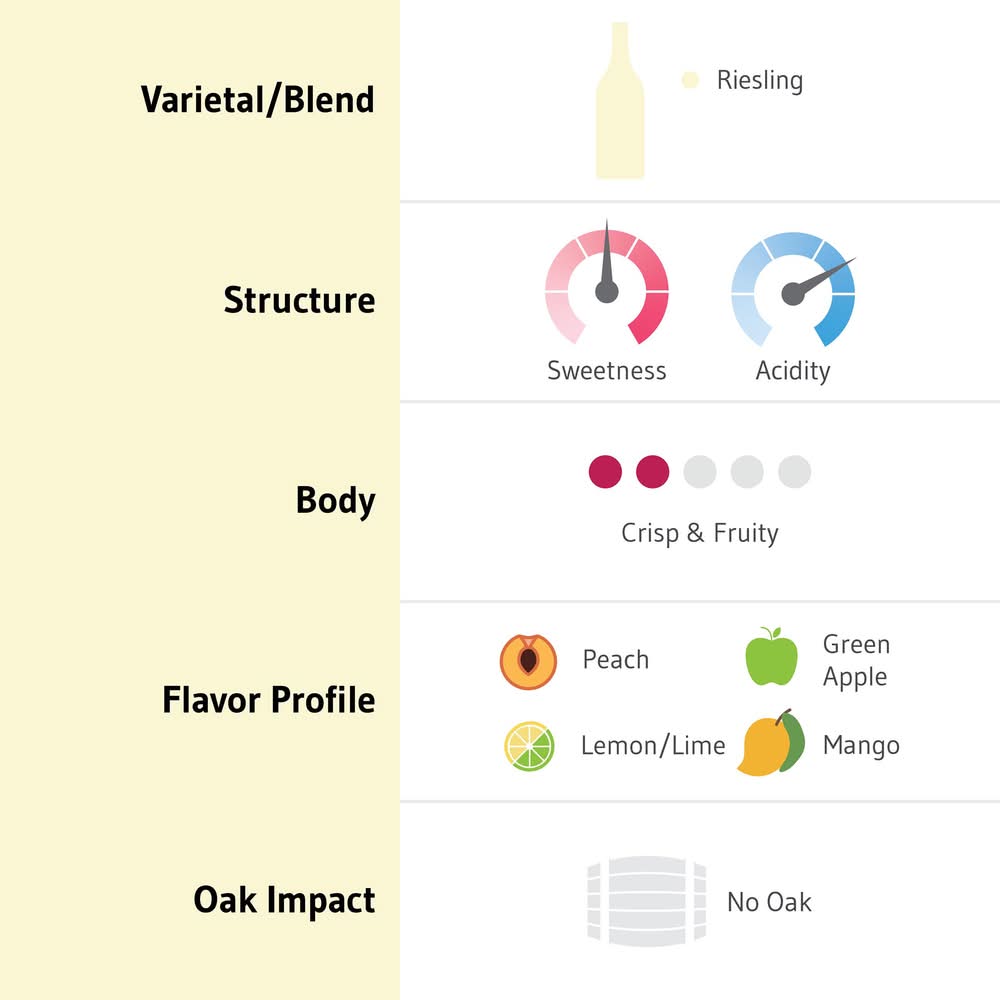 Harvested at the peak of ripeness, this crisp and lively riesling reveals tart apple and peach notes that complement pasta, pork, curry and a wide array of cheese.