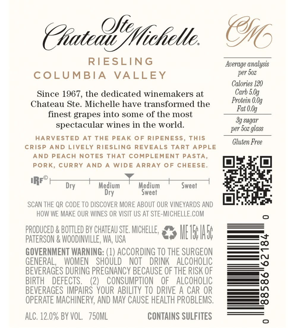 Chateau Ste. Michelle Riesling Columbia Valley White Wine, 2020 (750 ml)