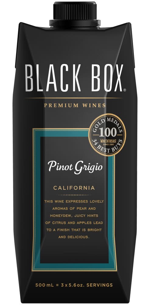 Made from grapes harvested in world-class appellations, Black Box Wines have won over 70 Gold Medals at wine competitions throughout the US and have been awarded over 34 Wine Enthusiast Best Buys. Through a meticulous winemaking process, each of our wines is crafted to be food-friendly, fruit-forward and easy-to-drink. Our award-winning Pinot Grigio expresses gentle aromas of pear and honeydew as juicy flavors of citrus and apples lead to a bright finish. This compact and recyclable Alcohol by volume: 12.5%