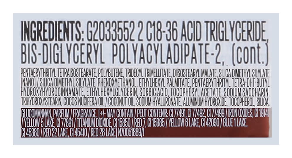 Ingredients: G2033552 2 C18-36 Acid Triglyceride, Bis-Diglyceryl Polyacyladipate-2, (Cont, ) Pentaerythrityl Tetraisostearate, Polybutene, Tridecyl Trimellitate, Diisostearyl Malate, Silica Dimethyl Silylate [Nano]/Silica Dimethyl Silylate, Phenoxyethanol, Ethylhexyl Palmitate, Pentaerythrityl Tetra-Di-T-Butyl Hydroxyhydrocinnamate, Ethylhexylglycerin, Sorbic Acid, Tocopheryl Acetate, Sodium Saccharin, Trihydroxystearin, Cocos Nucifera Oil/Coconut Oil, Sodium Hyaluronate, Aluminum Hydroxide, Tocopherol, Silica, Glucomannan, Parfum/Fragrance, [+/- May Contain/Peut Contenir: CI 77491, CI 77492, CI 77499/Iron Oxides, CI 19140/Yellow 5 Lake, CI 77891/Titanium Dioxide, CI 15850/Red 7, CI 15985/Yellow 6 Lake, CI 42090/Blue 1 Lake, CI 45380/Red 22 Lake CI 45410/Red 28 Lake]