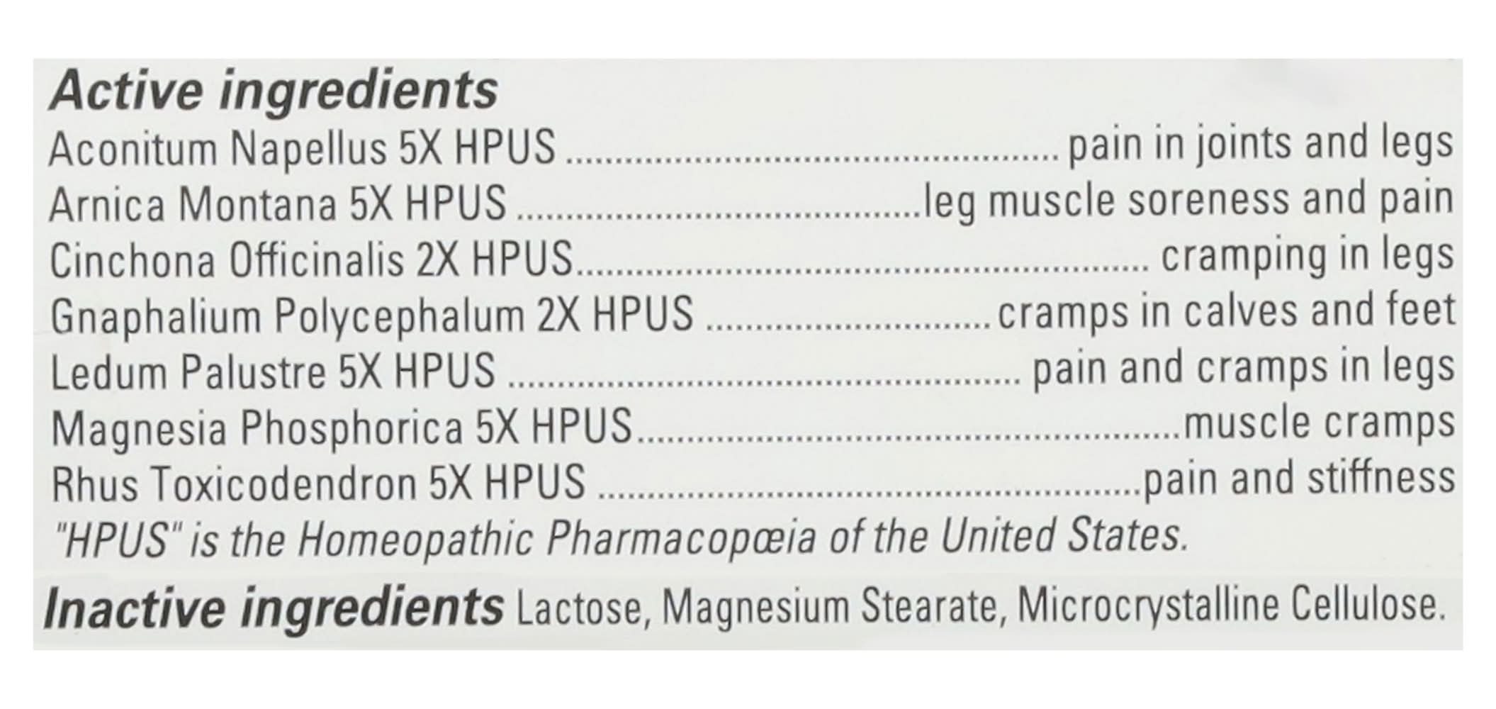 Ingredients: Active Ingredients: Aconitum Napellus 5X HPUS, Pain in Joints and Legs; Arnica Montana 5X HPUS, Leg Muscle Soreness and Pain; Cinchona Officinalis 2X HPUS, Camping in Legs; Gnaphalium Polycephalum 2X HPUS, Cramps In Calves and Feet; Ledum Palustre 5X HPUS, Pain and Cramps in Legs; Magnesia Phosphorica 5X HPUS, Muscle Cramps; Rhus Toxicodendron 5X HPUS, Pain and Stiffness. Inactive Ingredients: Lactose, Magnesium Stearate, Microcrystalline Cellulose. *"HPUS" is the Homeopathic Pharmacopoeia of the United States Contains: Lactose Additives: Inactive Ingredients: Lactose Magnesium Stearate Microcrystalline Cellulose