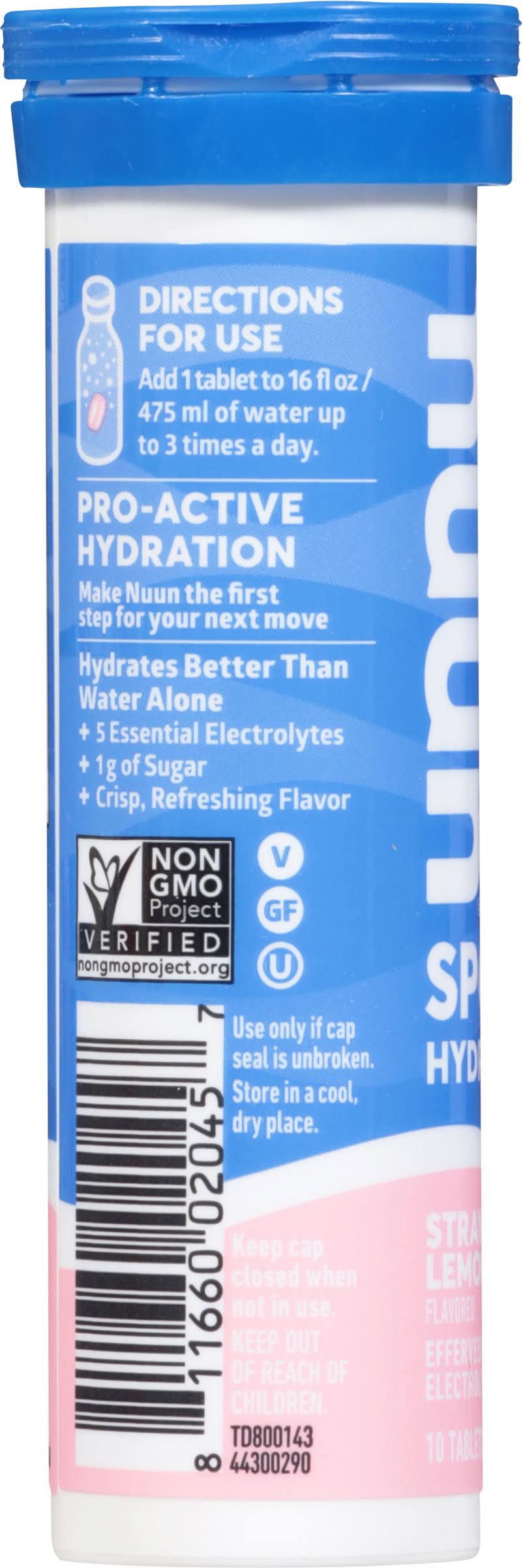 A tasty & hydrating blend of electrolytes for exercise and on-the-go. Serious Hydration When Breaking A Sweat. Optimized Electrolytes For An Active Life. Can Aid in Normal Muscle Function. When you sweat, your body loses vital minerals and electrolytes needed for healthy recovery and lasting performance. Nuun Sport provides a great balance of ingredients for mineral replenishment and optimal hydration before/during/after your workout. Certified Vegan by the American Vegetarian Association. • Flavor: Strawberry-lemonade • Pack size: 10 • Nuun & Co., Seattle, WA, 98134 • Packaging: Reusable