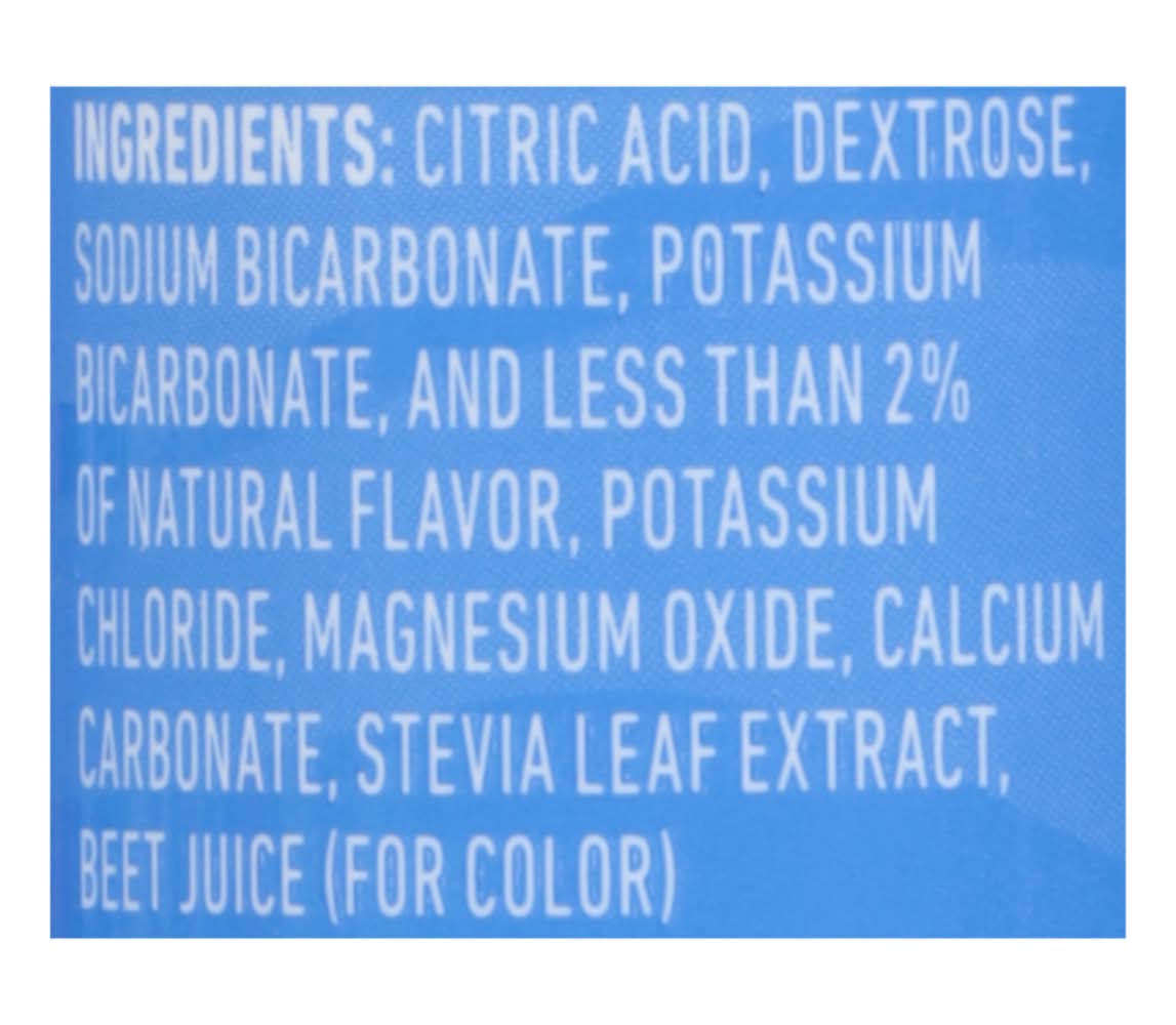 Ingredients: Citric Acid, Dextrose, Sodium Bicarbonate, Potassium Bicarbonate, and Less than 2% of Natural Flavor, Potassium Chloride, Magnesium Oxide, Calcium Carbonate, Stevia Leaf Extract, Beet Juice (for Color)