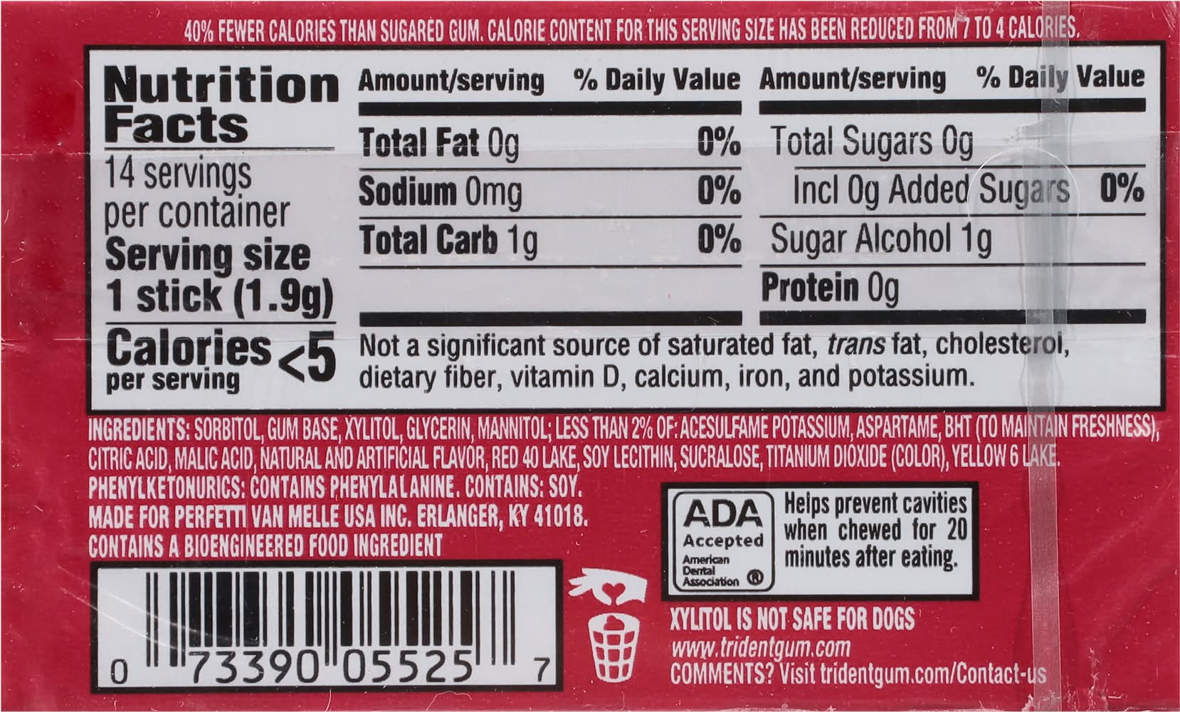 Ingredients: Sorbitol, Gum Base, Xylitol, Glycerin, Mannitol; Less than 2% of: Acesulfame Potassium, Aspartame, BHT (to Maintain Freshness), Citric Acid, Malic Acid, Natural and Artificial Flavor, Red 40 Lake, Soy Lecithin, Sucralose, Titanium Dioxide (Color), Yellow 6 Lake Contains: Soybeans