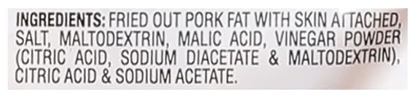 Ingredients: Fried Out Pork Fat with Skin Attached, Salt, Maltodextrin, Malic Acid, Vinegar Powder (Citric Acid, Sodium Diacetate & Maltodextrin), Citric Acid & Sodium Acetate