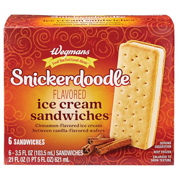 Cinnamon-flavored ice cream between vanilla-flavored wafers6 - 3.5 FL 0Z (103.5 mL) SandwichesOur Food You Feel Good About yellow banner is your shortcut to great-tasting products with no artificial colors, flavors or preservatives. Flavor: Snickerdoodle