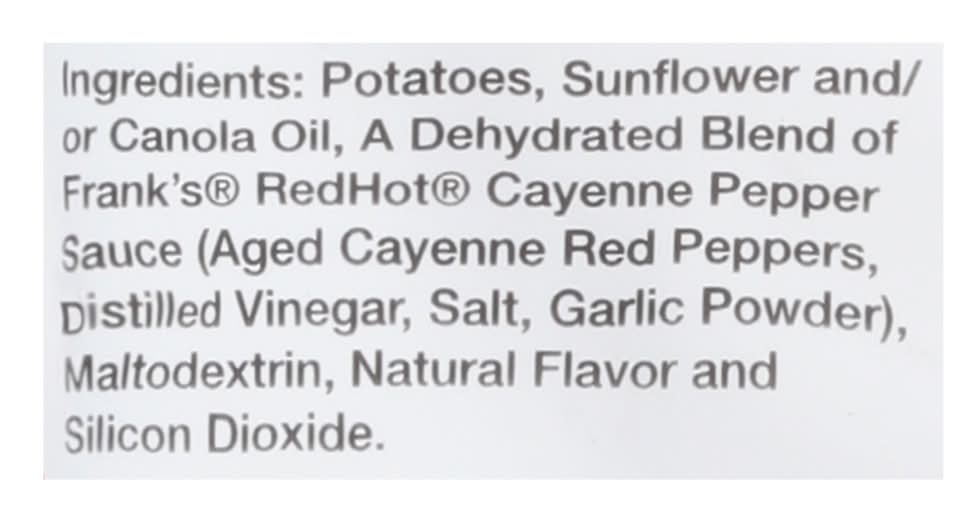 Ingredients: Potatoes, Sunflower and/or Canola Oil, a Dehydrated Blend of Frank's Redhot Cayenne Pepper Sauce (Aged Cayenne Red Peppers, Distilled Vinegar, Salt, Garlic Powder), Maltodextrin, Natural Flavor and Silicon Dioxide