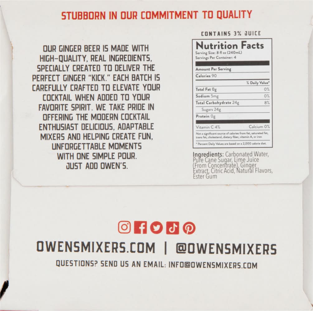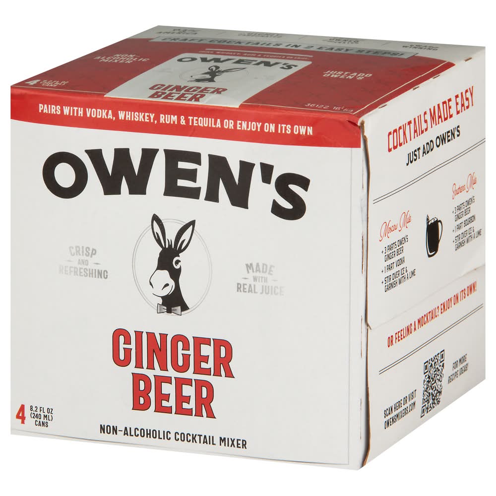 Directions: moscow mule + 3 parts owen’s ginger beer + 1 part vodka + stir over ice & garnish with a lime. southern mule + 3 parts owen’s ginger beer + 1 part bourbon + stir over ice & garnish with a lime. or feeling a mocktail? enjoy on its own!\r pairs with vodka, whiskey, rum & tequila or enjoy on its own.