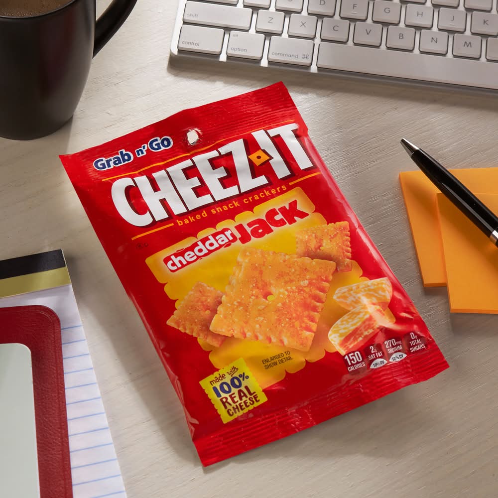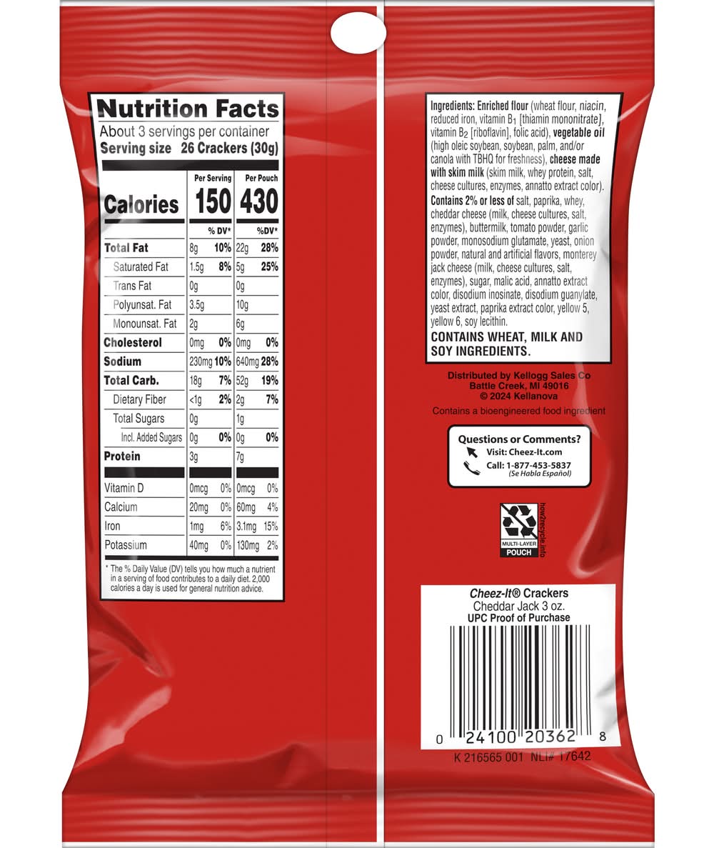 Made with a delectable combo of mellow cheddar and jack cheeses, Cheddar Jack Baked Snack Crackers are the ideal companion for lunchboxes, after-school snacks, and busy, on-the-go moments. Each delicious cracker has been baked to crisp perfection and is packed with 100% real cheese that has been perfectly aged for tasty, smile-making snacking. Light, flaky, and seasoned to perfection, Cheddar Jack Baked Snack Crackers are the easy-cheesy choice when it comes to scrumptious, sense-satisfying crunches by the mouthful. Kellogg Sales Co., Battle creek,MI,49016,USA