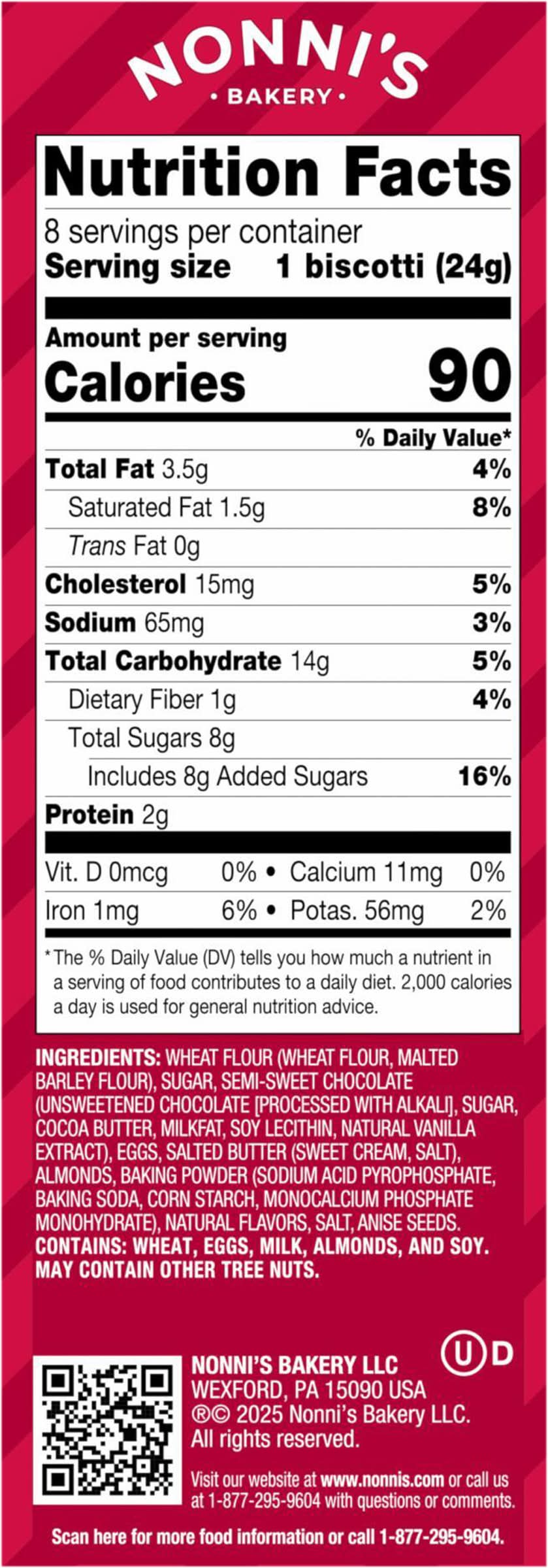 Ingredients: Wheat Flour (Wheat Flour, Malted Barley Flour), Sugar, Semi-Sweet Chocolate (Unsweetened Chocolate [Processed with Alkali], Sugar, Cocoa Butter, Milkfat, Soy Lecithin, Natural Vanilla Extract), Eggs, Salted Butter (Sweet Cream, Salt), Almonds, Baking Powder (Sodium Acid Pyrophosphate, Baking Soda, Corn Starch, Monocalcium Phosphate Monohydrate), Natural Flavors, Salt, Anise Seeds Contains: Tree Nuts, Soybeans, Tree Nuts, Milk, Eggs, Wheat