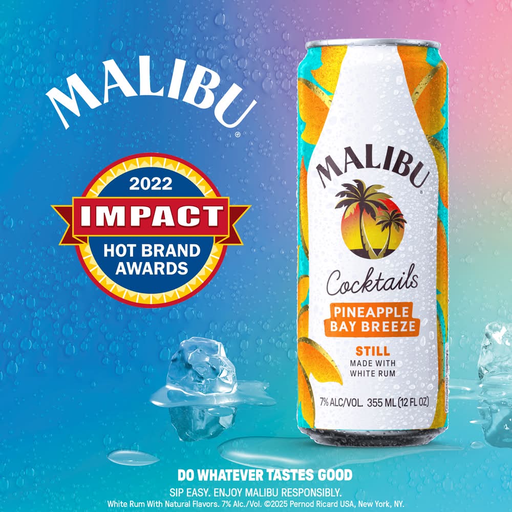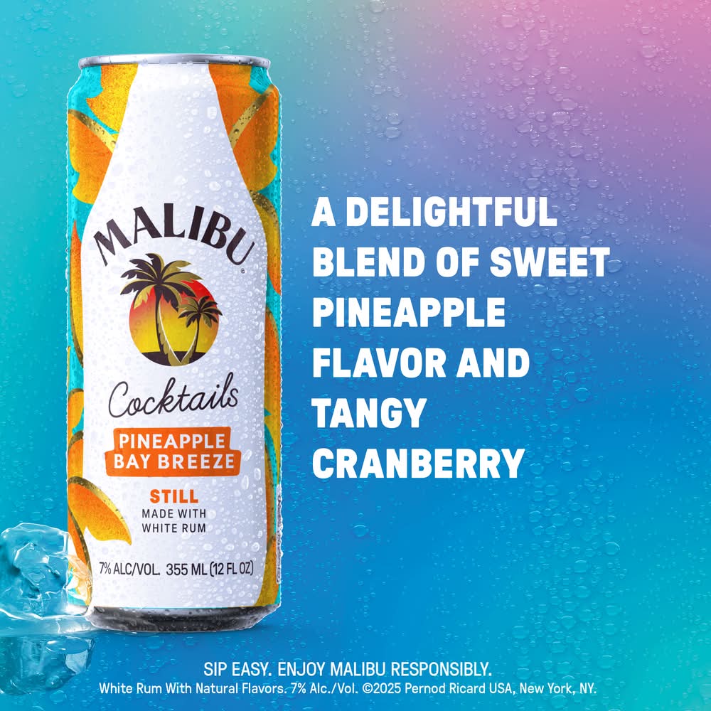 Enjoy the delicious and refreshing taste of a ready-to-sip Malibu Pineapple Bay Breeze, all in a convenient and sleek can. Perfect for your next hangout, these premixed cocktails offer the signature juicy pineapple and sweet coconut flavor of Malibu in your favorite cocktails on the go. • Brand: Malibu • Category: Fruit cocktail ready-to-drink • Flavor: Pineapple bay breeze • Pack size: 4 • Alcohol by volume: 7% • Malibu Spirits, 4500 Glencoe Ave, Chicago, Il 60630. • Packaging: Reusable