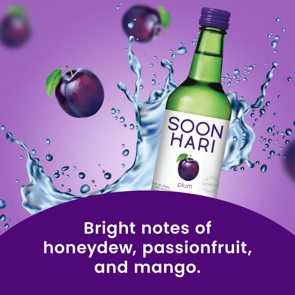 Discover a World of Flavors. Soonhari is the original flavored Soju, a Korean spirit made from Rice, Tapioca, Barley and Wheat with a neutral taste. Soonhari Plum is light and floral with notes of honeydew, passionfruit, and mango. Its light and velvety flavor profile makes for a refreshing sip. Pair this plum soju with mochi, grilled steak, and kimchi. Serve on the rocks, chilled or mixed with a splash of club soda. Soonhari comes in a variety of delicious flavors: Peach, Strawberry, Apple Mango, Yogurt, Apple, Grape, & Citron, Lychee and Plum. • Flavor: Plum • Alcohol by volume: 12%