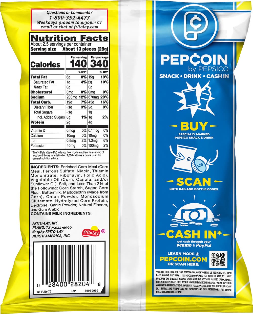 Ingredients: Enriched Corn Meal (Corn Meal, Ferrous Sulfate, Niacin, Thiamin Mononitrate, Riboflavin, Folic Acid), Vegetable Oil (Corn, Canola, and/or Sunflower Oil), Salt, and Less than 2% of the Following: Corn Starch, Sugar, Corn Flour, Buttermilk, Maltodextrin (Made from Corn), Onion Powder, Monosodium Glutamate, Hydrolyzed Corn Protein, Dextrose, Garlic Powder, Natural Flavors, and Gum Arabic Contains: Milk