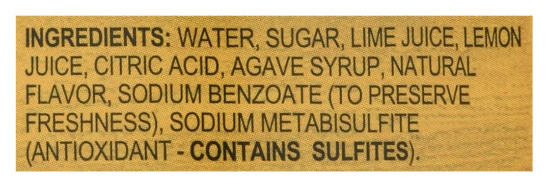 Ingredients: Water, Sugar, Lime Juice, Lemon Juice, Citric Acid, Agave Syrup, Natural Flavor, Sodium Benzoate (to Preserve Freshness), Sodium Metabisulfite (Antioxidant - Contains Sulfites) Contains: Sulfites