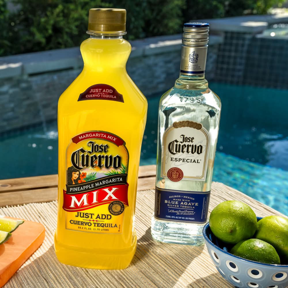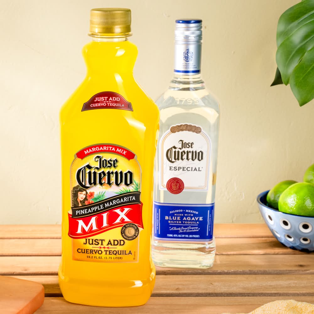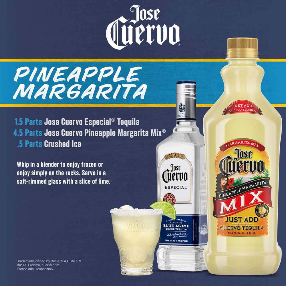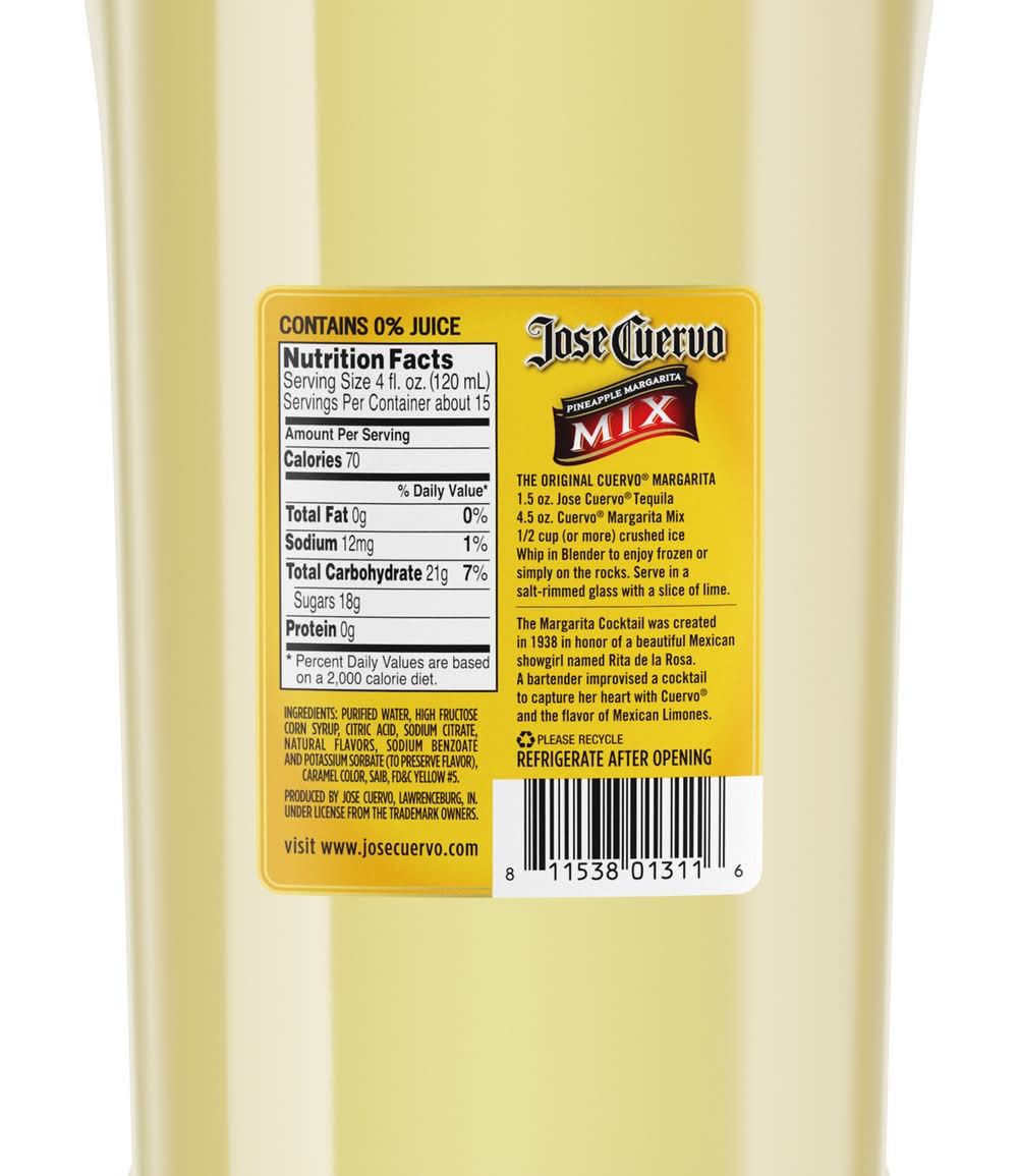 Jose Cuervo® Classic Pineapple Margarita Mix evokes freshly cut, golden pineapple and dark brown sugar. Its taste of sweet and juicy pineapples adds a tropical flourish to the classic margarita. On the rocks or frozen with crushed ice, it is the easiest way to enjoy America’s favorite cocktail with a tropical zing. Just add Cuervo® tequila and serve!