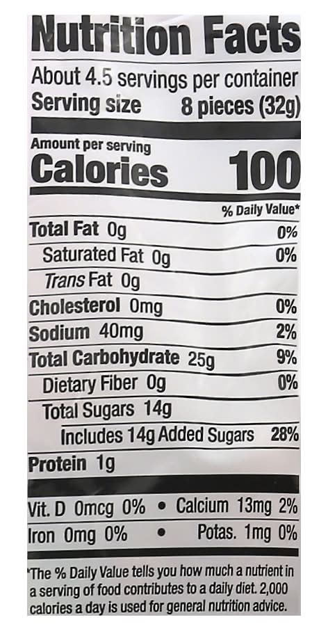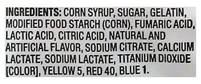 Ingredients: Corn Syrup, Sugar, Gelatin, Modified Food Starch (Corn), Furamic Acid, Lactic Acid, Citric Acid, Natural and Artificial Flavor, Sodium Citrate, Calcium Lactate, Sodium Lactate, Titanium Dioxide (Color), Yellow 5, Red 40, Blue 1 Contains: Milk, Peanuts, Tree Nuts, Eggs, Soybeans
