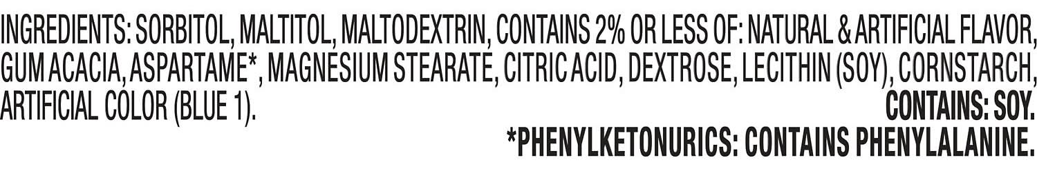 Ingredients: Sorbitol, Maltitol, Maltodextrin, Contains 2% or Less of: Natural Flavor and Artificial Flavor, Gum Acacia, Aspartame Phenylketonurics: Contains Phenylalanine, Magnesium Stearate, Citric Acid, Lecithin Soy, Artificial Color [Blue 1]. Contains: Soybeans, Corn Additives: Artificial Flavors, Genetically Modified Ingredients