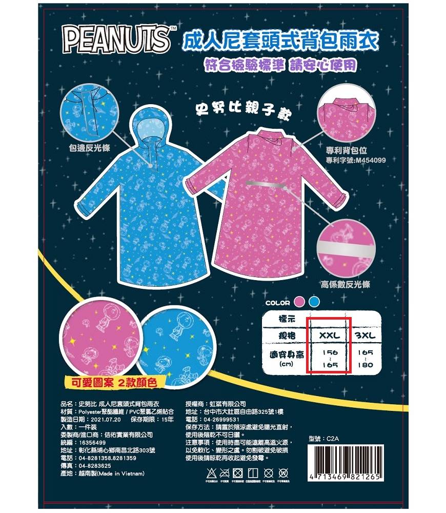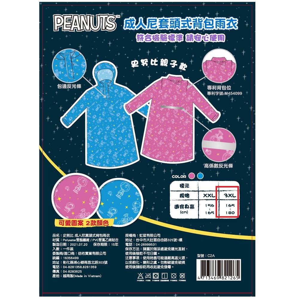 史奴比成人尼套頭式背包雨衣 - 3XL