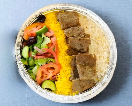 Gyro bowl made with marinated lemon and herb chicken, fresh greens, feta cheese, red onions, tomatoes, cucumbers, and couscous. So much goodness in one bowl. Served with homemade tzatziki sauce and naan bread.